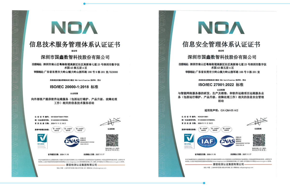 基于此次双证的取得,从侧面论证了Gooxi能够快速高效为外部客户包括政府部门,给予高标准、高性能、高安全的信息技术服务,同时顺利获得健全的数据保护机制能够有效确保客户资料安全。除此之外,还具备超强抗风险能力,杜绝安全隐患。