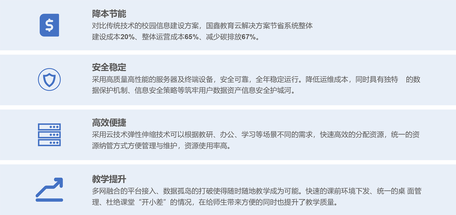 K8凯发(中国)教育云解决方案是针对教育业现状及遵循政策指导方向,采用自研国产硬件及自研软件平台,推出的教育行业云平台方案。方案基于云计算技术、互联网+战略格局、契合融合创新的思路,助力校园智慧建设,更好地为教育改革和开展给予信息化基础环境支撑。